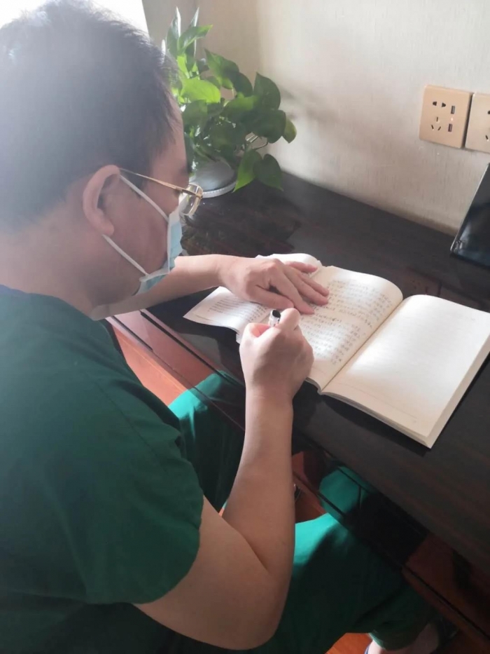 在不分日夜的忙忙碌碌中,一个隔离周期过去了,按照院领导部署,他们需要自身隔离休整,脱下防护服,来到隔离房间,谢亚峰拿出了这一段时间的防护培训、诊疗笔记认真总结起来。因为他知道,疫情没有结束,战疫还要继续,勇士还在拼搏,他不能有丝毫放松,……