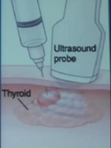 甲状腺细针穿刺细胞学活检(FNA)是国内外甲状腺疾病诊疗指南中一致推荐的对于甲状腺结节良恶性评估的首选检查方法, 可明确诊断甲状腺结节的良恶性,准确性可达95%。FNA仅采用一支外径只有0.7mm的穿刺针,精准安全、无痛快捷、无需住院,不伤及正常组织及器官功能,小针头解决大问题。目前,国内仅有少数医院开展此项技术检查。 超声引导下穿刺完全实现了动态监测,精确定位,精准穿刺,操作简捷迅速,用途十分广泛,涉及到临床多个科室的诊断治疗,除了能在甲状腺、乳腺、浅表淋巴结等浅表器官或病灶发挥优势的领域,还可以引导肝脏穿刺、肾脏穿刺、胸膜腔及腹腔少量积液穿刺、心包穿刺、子宫位置异常、子宫发育畸形、血管通路穿刺、麻醉穿刺等,可以满足不同临床科室不同的临床需求。